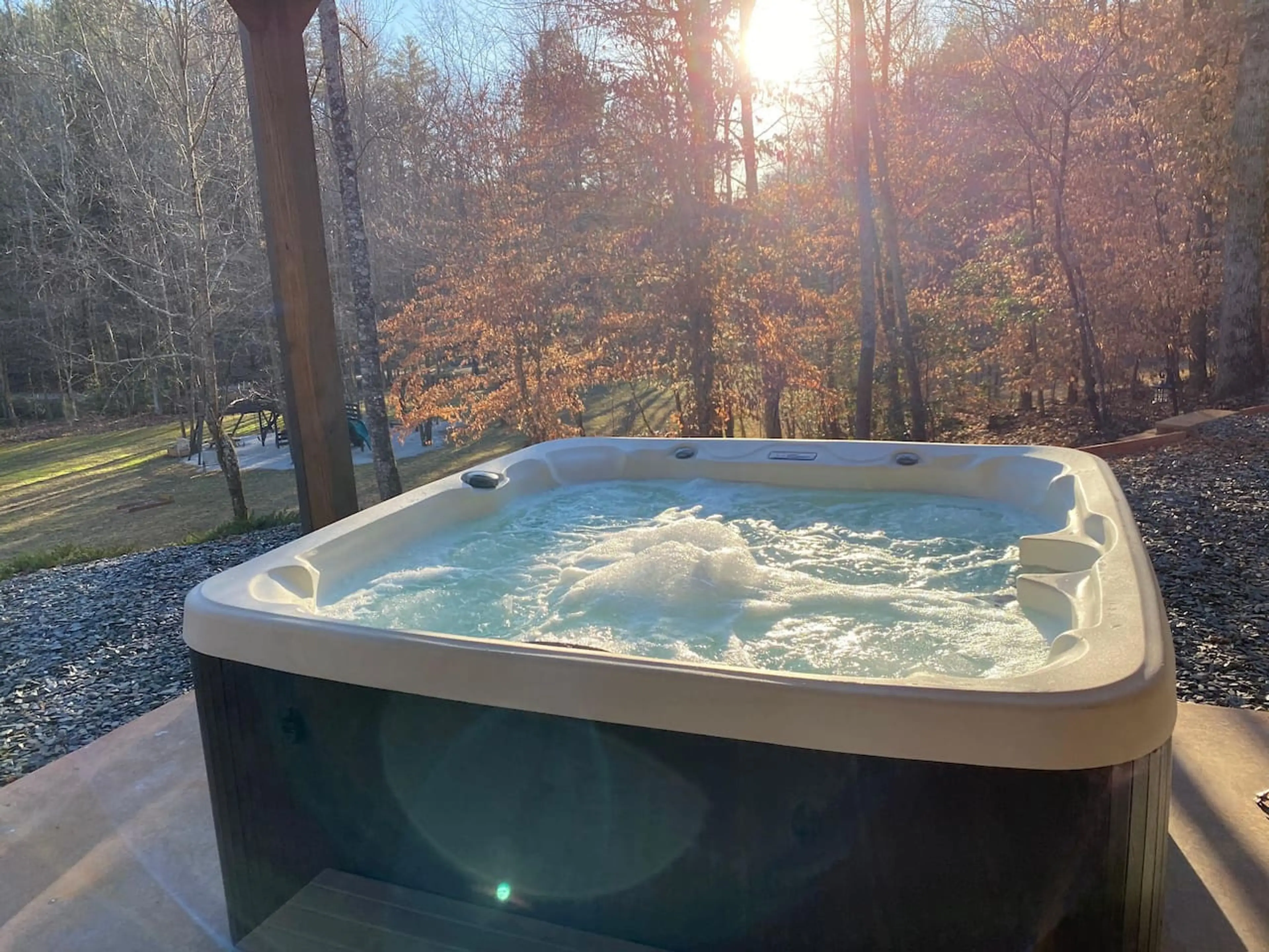 This wheelchair-accessible cabin is pet-friendly (pet fee applies*) and located in Lumpkin County near Dahlonega. Whether you're here to tour the wineries, or just want to stay in and soak in the hot tub, this cabin is for you. The cabin features a hot tub, playground, volleyball court, fire pit, p...